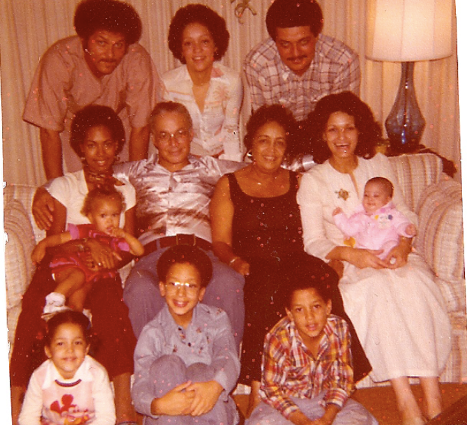 My Uncle Julius, Aunt Jill and my dad are standing behind the couch where my Aunt Debra, holding my cousin Aisha, is sitting next to my Grandpa Julius, Grandma Adele and my Mom who is holding me. My sister, Nicolle, and my brothers, Ralph, Jr. and Sean, are sitting on the floor.